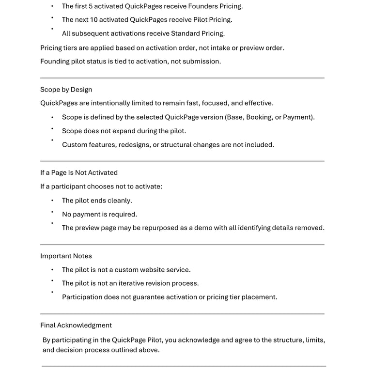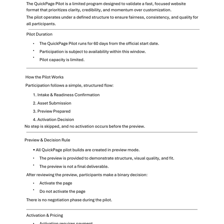 These terms explain how the QuickPage pilot works, including preview-first builds, activation decisions, pricing tiers, and scope limits.